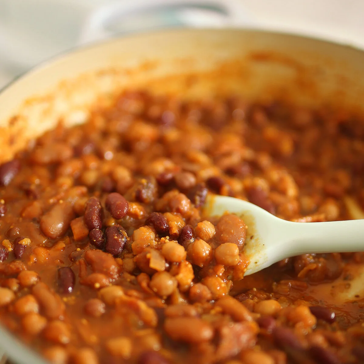 Deliciously rich Homemade Baked Beans with bacon and our Tomato and Basil Pasta Sauce, in a thick, glossy sauce with a hint of sweetness and tang. These Southern style baked beans could be eaten for breakfast, lunch or dinner.