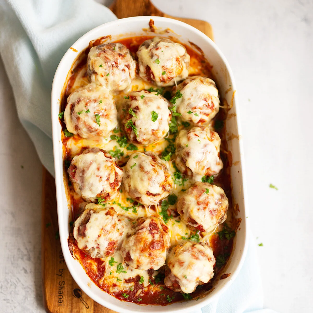 Baked Meatballs made with our Pasta Sauce range and topped with plenty of grated cheese!