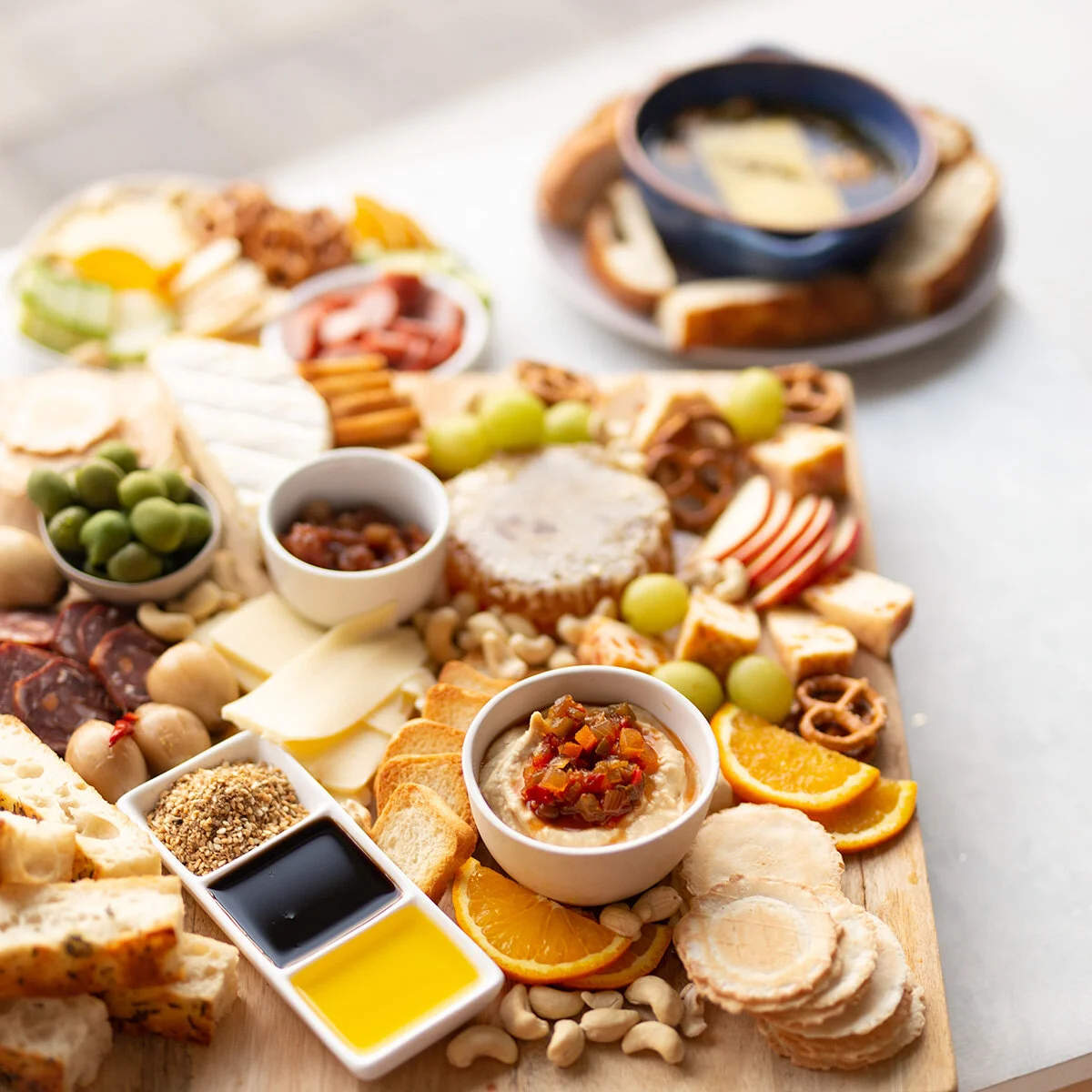 Assemble board starting with large items first, then use smaller items such as nuts to fill the gaps. Try to group similar flavoured foods, such as meat, olives and pickled onions together then the sweeter items such as honeycomb, apricot cheese and fruit together