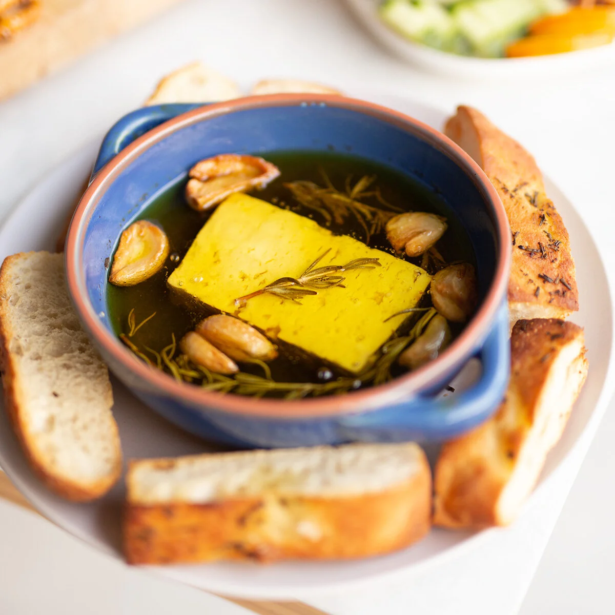 Pre heat oven to 200C.  Place feta in a small, oven proof dish, add the garlic and rosemary then cover with oil.  Bake uncovered for 25 minutes or until oil is molten and garlic is caramelised.